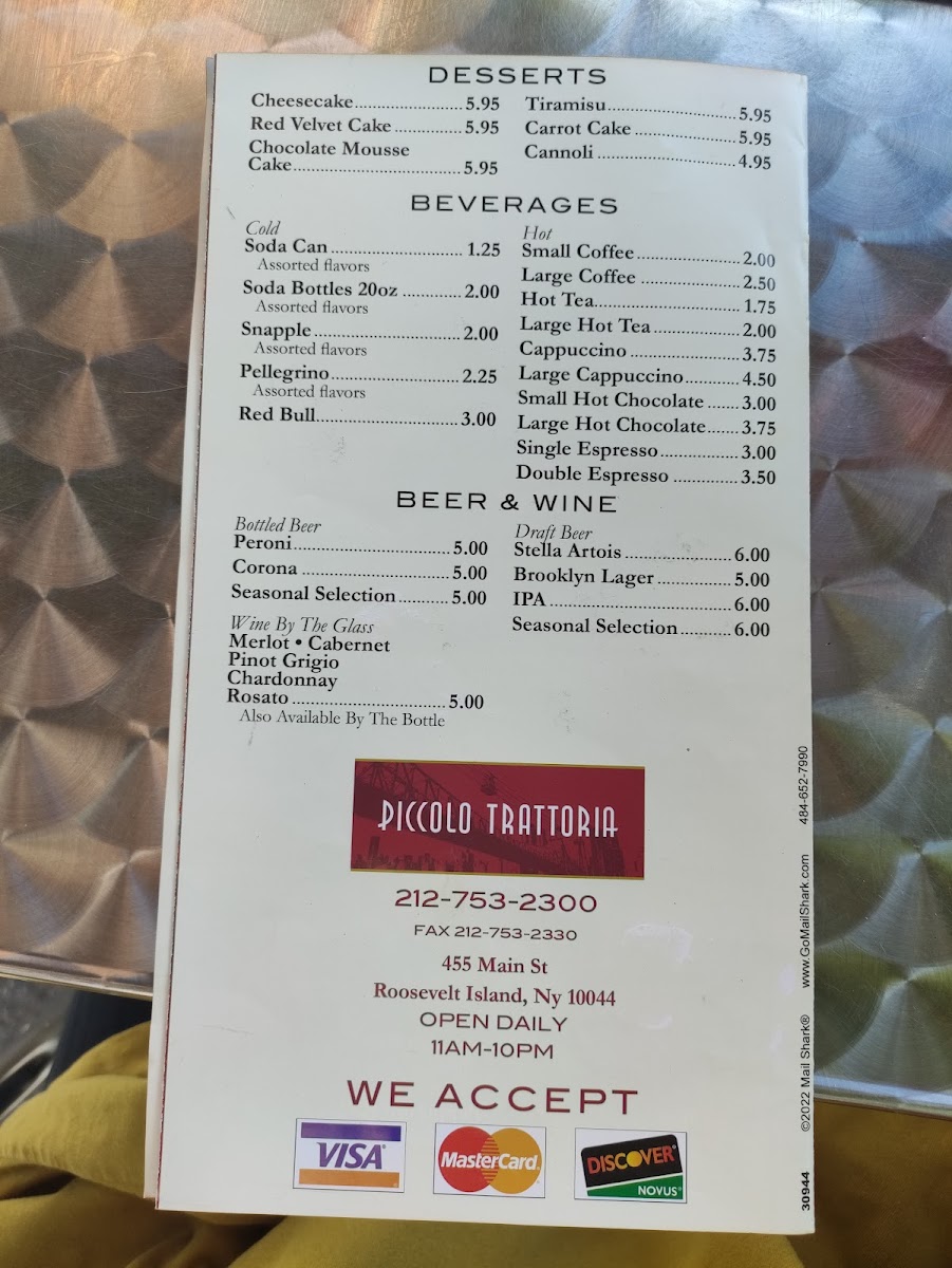 Welcome to Piccolo Trattoria Ristorante Pizzeria, your gateway to authentic Italian flavors nestled in the heart of Roosevelt Island at 455 Main St, New York, NY 10044.